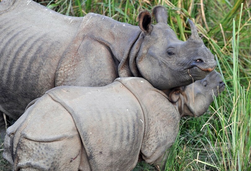 イッカクサイはかつてネパール南部の平原に何千頭も生息していたが、密猟や生息地への人の侵入によって20世紀後半に約100頭にまで減少。その後の密猟対策や保護活動によって、この10年で約645頭まで回復している。(c)AFP