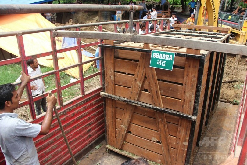 若いイッカクサイの雌「ルドラ(Rudra)」と雌の「ルプシ(Rupsi)」は、ネパールの専門家チームが同乗したチャーター機で中国・広州(Guangzhou)省に送られた。2頭は同省の自然動物園で飼育される。これとは別の雄と雌も、ネパールから中国に送られる予定だ。