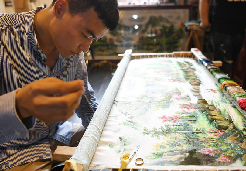【7月15日 CNS】中国・吉林省(Jilin)長春市(Changchun)にある庄東陽(Zhuang Dongyang)さんのアトリエには、刺しゅうの作品が飾られている。