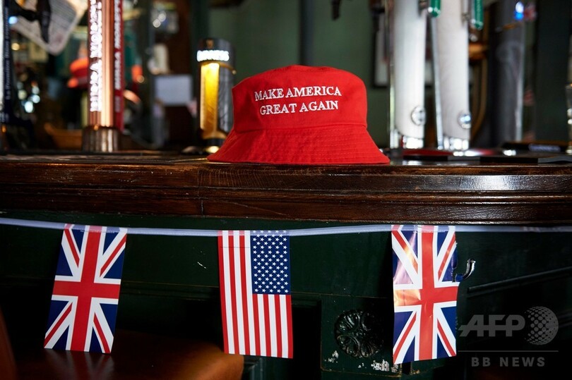 ハマースミス(Hammersmith)地区にあるパブ「ジェムソン( Jameson)」では、店の内外を星条旗で飾り立て、14日に開催する歓迎パーティーに備えている。店内にはトランプ大統領の等身大パネルが立ち、2016年米大統領選でおなじみとなった「Make America Great Again(米国を再び偉大に)」と書かれた赤い帽子がたくさん並ぶ。