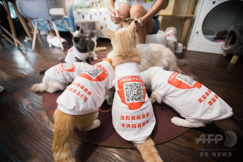 客は猫の服の背中にプリントされている口碑のQRコードをスキャンして料理を注文し、口碑のアプリや支付宝(アリペイ、Alipay)で支払いもできる。(c)CNS/JCM/AFPBB News