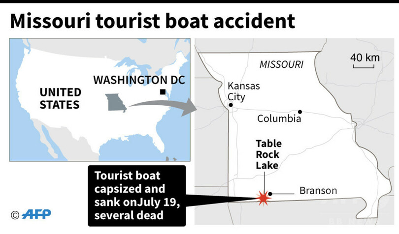 【7月20日 AFP】(更新)米ミズーリ州の人造湖テーブルロック湖(Table Rock Lake)で19日夜、31人を乗せた水陸両用の観光船が突然の嵐に見舞われ転覆・沈没し、17人の死亡が確認された。当局が明らかにした。