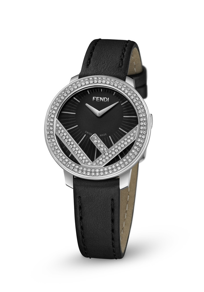 「ラナウェイ」シリーズの魅力は、文字盤の上に配置された逆さまの"F"をモチーフとした、新しいモノグラム「F is Fendi」ロゴ。デザイナーのカール・ラガーフェルド(Karl Lagerfeld)によって、「F en Folie(エフ アン フォーリー=「狂ったF」の意)」と名づけられたこのロゴは、全体のデザインを引き立てる存在だ。