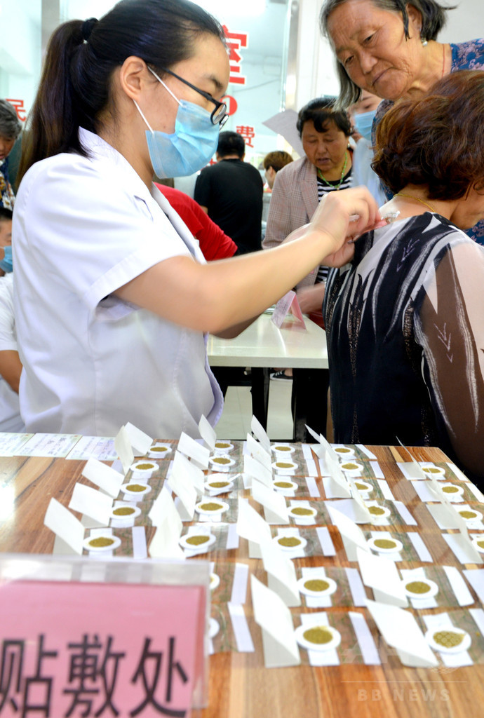 「冬の病気を夏に治療する」とは、中国伝統医学の治療方法のひとつで、ツボに中国伝統薬を塗布することで病気の予防と治療をし、免疫力を高める。三伏の時期に治療をすることで、冬にかかりやすい風邪やせきなどの病気を予防できる。(c)CNS/JCM/AFPBB News