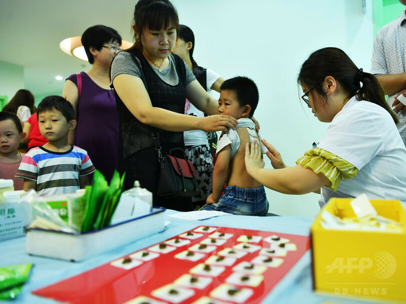 「冬の病気を夏に治療する」とは、中国伝統医学の治療方法のひとつで、ツボに中国伝統薬を塗布することで病気の予防と治療をし、免疫力を高める。三伏の時期に治療をすることで、冬にかかりやすい風邪やせきなどの病気を予防できる。(c)CNS/JCM/AFPBB News