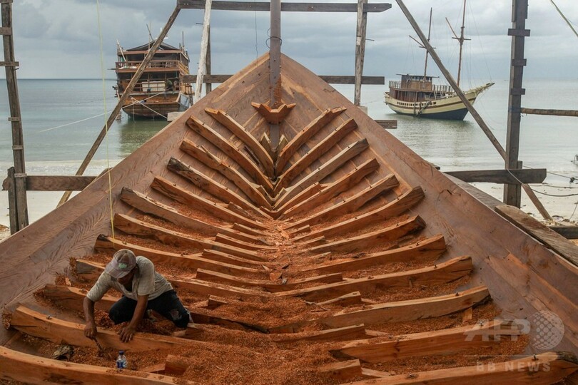 【7月28日 AFP】照りつける熱帯の太陽の下、インドネシアの船大工らが近隣産の木材に金づち、きり、のみを振るい、2本マストの伝統的で複雑な帆船を造り上げていた。この国の島々の沖を数世紀にわたって進んできたような船だ。