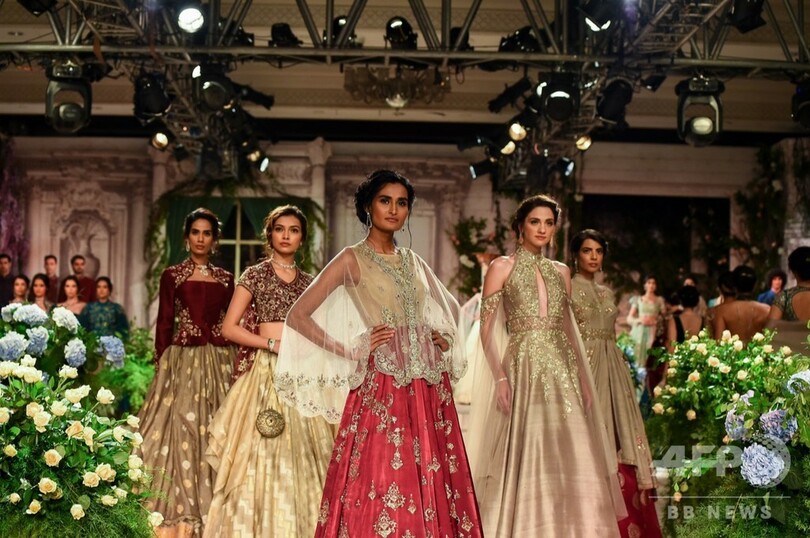 25日には、現地デザイナーの「アンジュ・モディ(Anju Modi)」、「タルン・タヒリアニ(Tarun Tahiliani)」がそれぞれ新作を発表した。(c)AFP