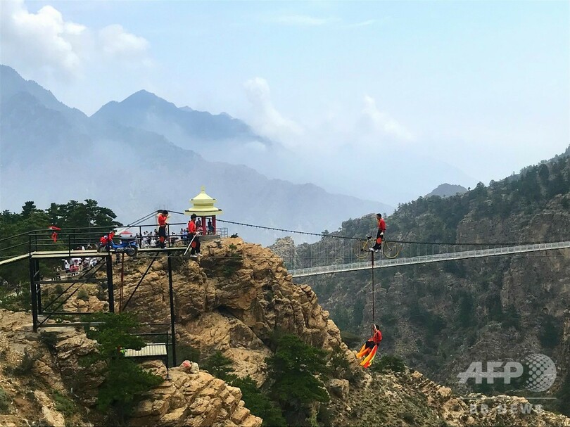 河北省(Hebei)呉橋県(Wuqiao)飛飛雑技団の団員らが、長さ300メートルの鋼のケーブルの上で、自転車やバイクで手に汗握る特技を披露し、観客を魅了した。(c)CNS/JCM/AFPBB News