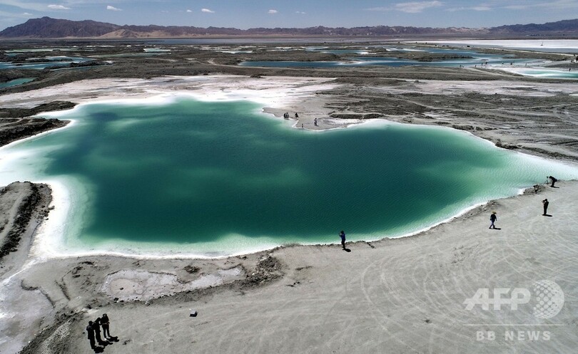 【7月30日 CNS】中国・青海省(Qinghai)西蒙古族蔵族自治州。さまざまな形態、深さの異なる塩湖が、ヒスイのごとく光り輝いていた。約6平方キロの「ヒスイ湖」の正式名称は、大柴旦湖(Dachaidan Lake)といい、大柴旦化工廠塩湖採掘隊の採掘エリアだった場所にある。長年の採掘で、「ヒスイ湖」ができた。湖畔にたたずむと、鏡のような湖面に藍色の空と白雲、雪を抱いた山々が映り、仙境のようだった。(c)CNS/JCM/AFPBB News
