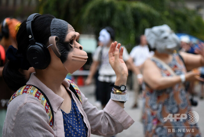今回初めてサイレントフェスに参加した都内在住の会社員、樫原ひで子(Hideko Kashihara)さん(38)は、「ヘッドホンを外して眺めるとすごくシュール。やってる本人は楽しい」と象のお面を着け直した。28日は台風接近により中止。(c)AFPBB News