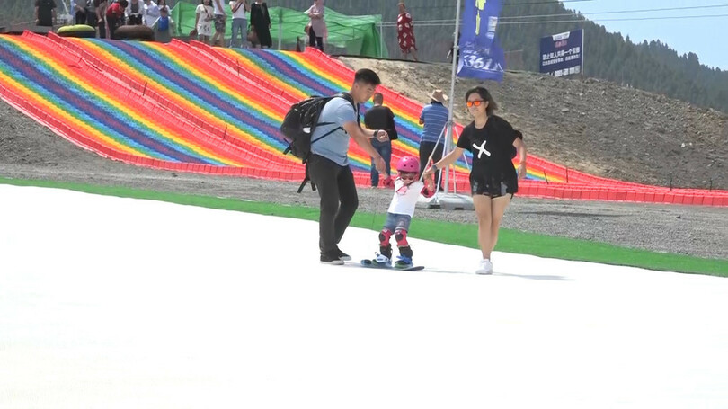 冬を待てない人たち、夏の装いでスキー体験 新疆ウイグル自治区