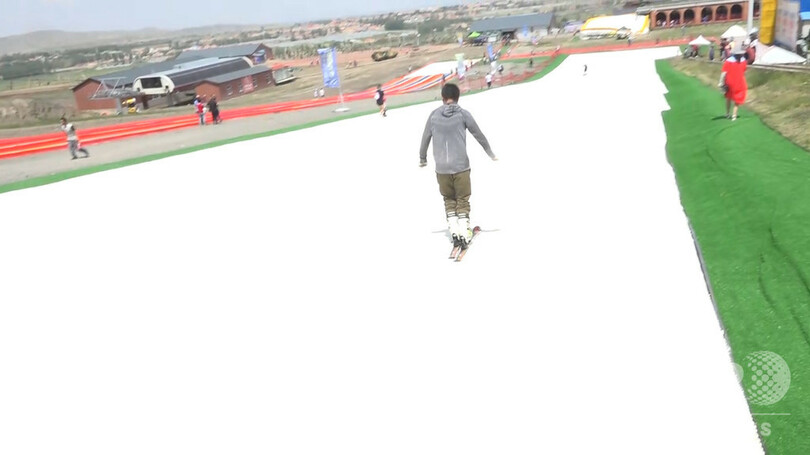 冬を待てない人たち、夏の装いでスキー体験 新疆ウイグル自治区