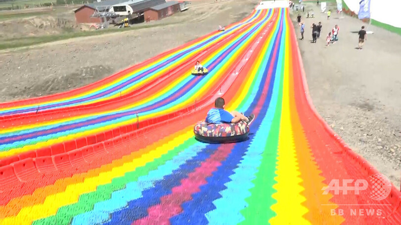 スキーやスノーボードだけではなく、虹色のコースを浮き輪で滑る子ども向けのアトラクションもあり、家族連れがたくさん訪れていた。(c)CNS/JCM/AFPBB News