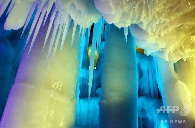 深さ100メートル以上からなる5層の水晶宮になっており、氷に覆われた壁は年中解けることなく、ライトに照らされた氷柱やつらら、氷の瀑布や鍾乳洞などの景色が広がっている。(c)CNS/JCM/AFPBB News