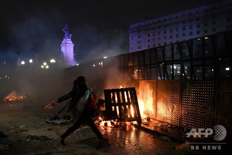 広場の片隅では、緑のシンボルカラーをまとった中絶賛成派が涙を流す姿も。一部のデモ隊が治安部隊と衝突し、放火や投石などを行う騒ぎも起きた。(c)AFP