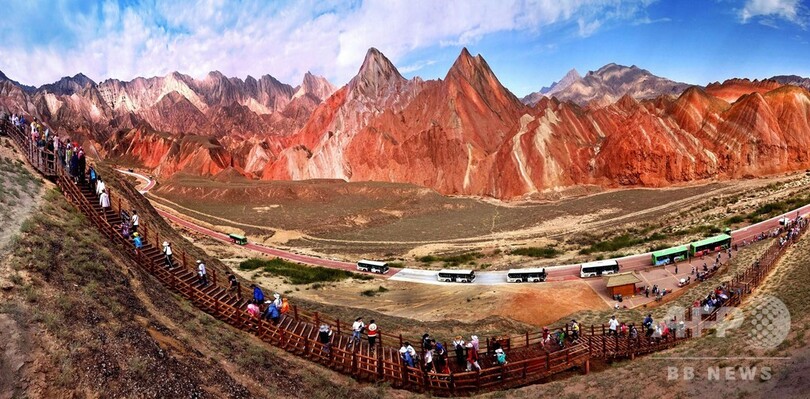 【8月22日 CNS】中国・甘粛省(Gansu)張掖市(Zhangye)にある張掖丹霞地貌(Zhangye Danxia landform)。8月に入り、多くの観光客が訪れている。