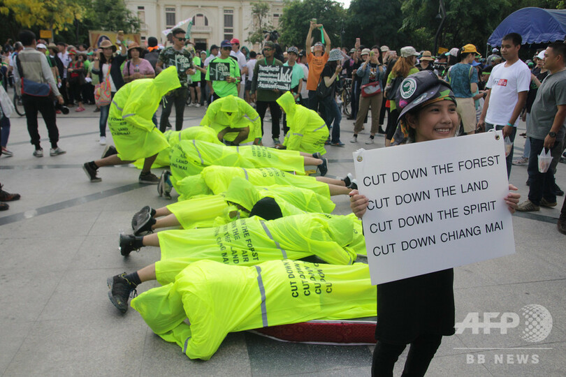 この写真はタイでの政府公営住宅団地建築に対するデモ活動の写真である。この建築によって森林が失われるため国ではなく市民が立ち上がった。森林保護のために我々一人一人が強く意識していかなければならない。