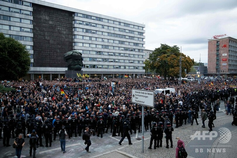 【8月28日 AFP】ドイツ東部ケムニッツ(Chemnitz)で27日、数千人規模の極右らが集会を行い、それに対抗するデモ隊とにらみ合いになった。警察によると、発火物などの投げ合いによって数人が負傷して病院で手当てを受けた。ケムニッツでは前日、移民が犯人とされる殺人事件が起き、反発した極右らが暴徒化していた。