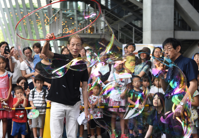 東京・千代田区で8月に行われた、子ども向けワークショップ「シャボン玉ブラザーズのシャボン玉ショー」の一幕だ。ステージ前に吸い寄せられた子どもたちは歓声を上げながら、舞い上がるシャボン玉に手を伸ばしていた。