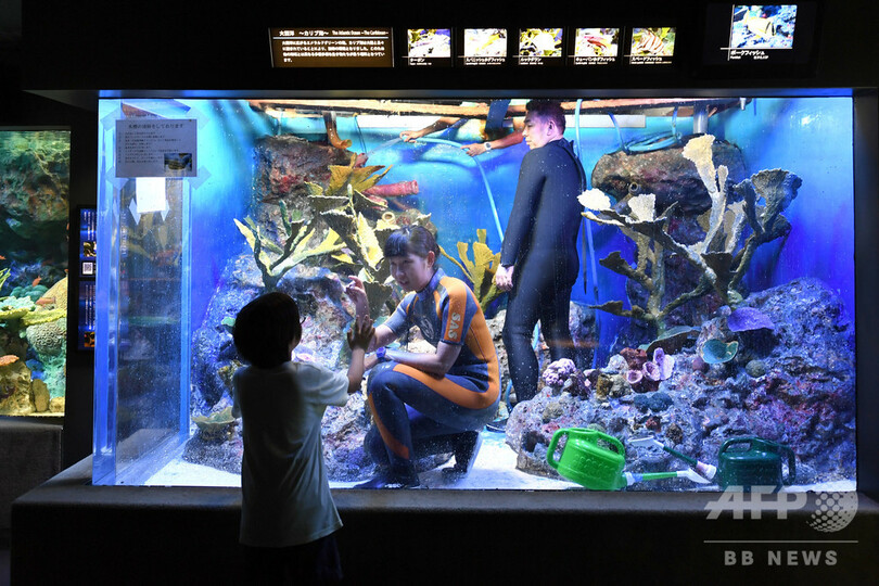 【9月7日 AFPBB News】子どもたちが歓声を上げ手を振って眺める水槽には魚ではなくウェットスーツを着込んだ男女の人間。東京・池袋の「サンシャイン水族館(Sunshine Aquarium)」で5日、「水槽ピカピカ大作戦」が行われ、水槽の清掃が一般公開された。