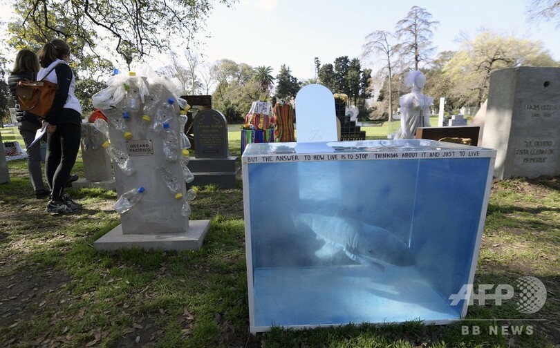 【9月11日 AFP】アルゼンチンの首都ブエノスアイレスで10日、アートフェス「アート・バーゼル(Art Basel)」に展示されたイタリア人アーティスト、マウリツィオ・カテラン(Maurizio Cattelan)による作品「Eternity(永遠)」を鑑賞する市民の姿が見られた。この作品は、公募による参加型アートで、友人、恋人、英雄など存命中の人々や架空のキャラクターの墓を集めている。