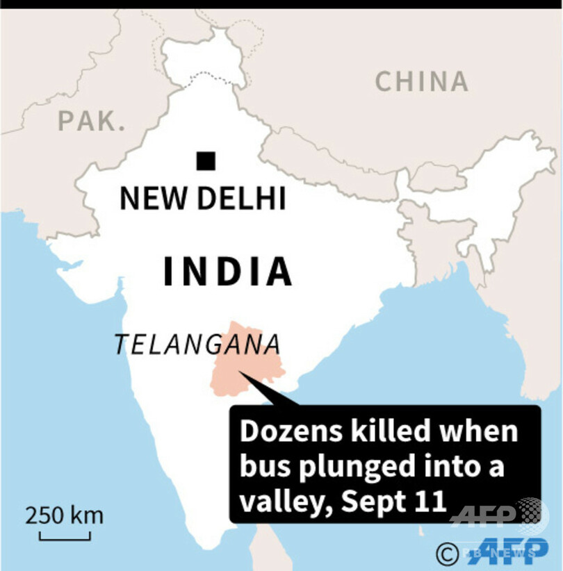 【9月11日 AFP】(更新)インド南部テランガナ(Telangana)州で11日、巡礼者らを乗せたバスが谷に転落し、50人が死亡した。当局が発表した。インドでは毎年15万人超が道路上の事故で亡くなっているが、今回の事故ではここ数年で最悪規模の被害が出たとみられる。