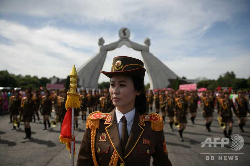【9月12日 AFP】北朝鮮の平壌郊外の祖国統一三大憲章記念塔(Three Charters Monument)で11日、「平和、繁栄、統一のための国際的行進」が行われ、国内の様々な友好団体が参加した。伝統的な衣装を着た女性たちや朝鮮人民軍のマーチングバンドなども集まり、建国70周年を祝った。(c)AFP