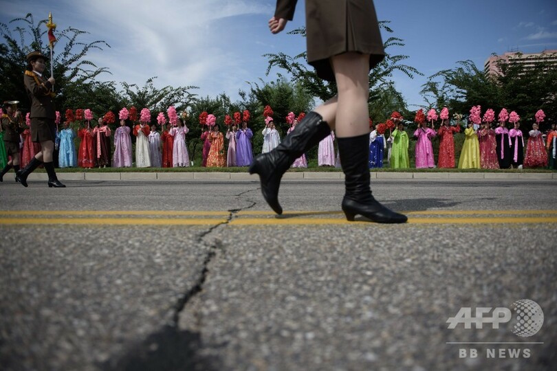 【9月12日 AFP】北朝鮮の平壌郊外の祖国統一三大憲章記念塔(Three Charters Monument)で11日、「平和、繁栄、統一のための国際的行進」が行われ、国内の様々な友好団体が参加した。伝統的な衣装を着た女性たちや朝鮮人民軍のマーチングバンドなども集まり、建国70周年を祝った。(c)AFP