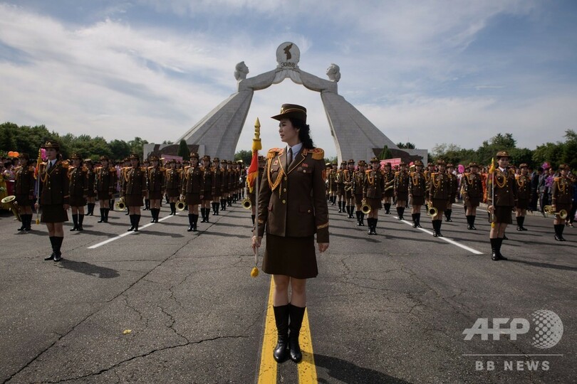 【9月12日 AFP】北朝鮮の平壌郊外の祖国統一三大憲章記念塔(Three Charters Monument)で11日、「平和、繁栄、統一のための国際的行進」が行われ、国内の様々な友好団体が参加した。伝統的な衣装を着た女性たちや朝鮮人民軍のマーチングバンドなども集まり、建国70周年を祝った。(c)AFP