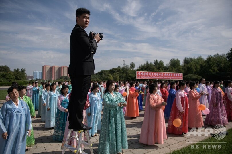 【9月12日 AFP】北朝鮮の平壌郊外の祖国統一三大憲章記念塔(Three Charters Monument)で11日、「平和、繁栄、統一のための国際的行進」が行われ、国内の様々な友好団体が参加した。伝統的な衣装を着た女性たちや朝鮮人民軍のマーチングバンドなども集まり、建国70周年を祝った。(c)AFP