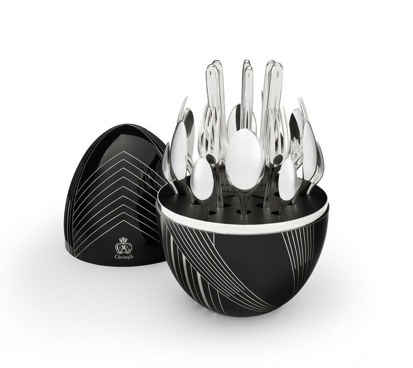 ケース表面には、クリストフルの紋章とカール・ラガーフェルドの署名が、ケース下部にはシリアルナンバーが刻印され、カトラリー表面にはケース同様のグラフィックラインが施された。オブジェとしてだけでなく、特別な機会や日々の食卓で機能的に使えるカトラリーセットでエレガントな食卓を演出して。