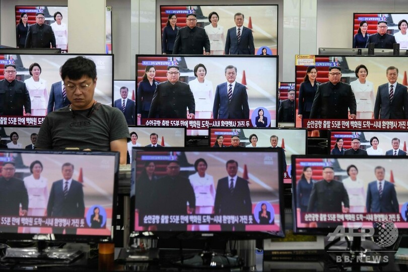 テレビ映像では、文氏が専用機のタラップを下りた後、両首脳が抱擁する様子が確認できる。文氏には夫人が同行し、正恩氏の李雪主(リ・ソルジュ、Ri Sol-Ju)夫人も空港に姿を見せた。