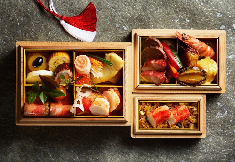 ミシュランガイドに掲載され美食の殿堂と称される、マンダリン オリエンタル 東京のおせちは、食材、 調理法、バランスにこだわった和洋中折衷の三段重箱入り。一の重と二の重には、広東料理「センス」が誇る 「窯焼きチャーシュー」「アワビの姿煮込み」、伝統的なおせち料理をアレンジした「ブリの広東風照り焼き」や「蟹肉と干し貝柱のフライドライス」が入り、三の重には「カニ入り伊達巻」や「国産 サーロインのロースト」など豪華メニューがぎっしりと贅沢に詰め合わされた。コース料理のようにひとりでも愉しめるよう構成された、毎年人気のおせちだ。