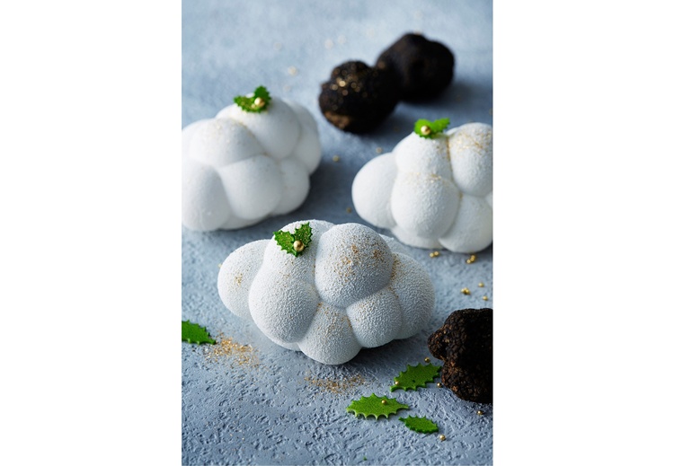 空に浮かぶ雲のような形が可愛らしいケーキ「KUMO®」に、個数限定でフランス産の黒トリュフフレーバーが登場。厳選された2種類のバニラを使ったムースとトリュフクリームをホワイトチョコレートで包み、キャラメル、ショートブレッド、 スポンジの食感をアクセントに加えた贅沢なスイーツ。