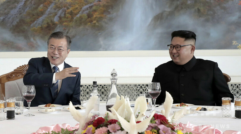【9月20日 AFP】韓国の文在寅(ムン・ジェイン、Moon Jae-in)大統領と北朝鮮の金正恩(キム・ジョンウン、Kim Jong-Un)朝鮮労働党委員長は19日午後、平壌の老舗冷麺店「玉流館(オンリュグァン、Okryukwan)」で昼食会を開いた。両首脳は時に談笑しながら平壌名物の冷麺に舌鼓を打った。