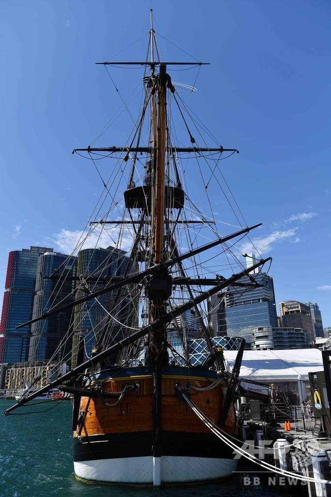 オーストラリア・シドニーのダーリングハーバー(Darling Harbour)には現在、豪近代史の重要な記念碑として、エンデバー号を復元した帆船が係留されている。(c)AFP