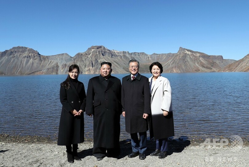 【9月20日 AFP】(更新、写真追加)韓国の文在寅(ムン・ジェイン、Moon Jae-in)大統領と北朝鮮の金正恩(キム・ジョンウン、Kim Jong-Un)朝鮮労働党委員長は20日、北朝鮮北部の対中国境にある朝鮮民族の聖地、白頭山(ペクトゥサン、Mount Paektu)を訪れ、共に登頂した。