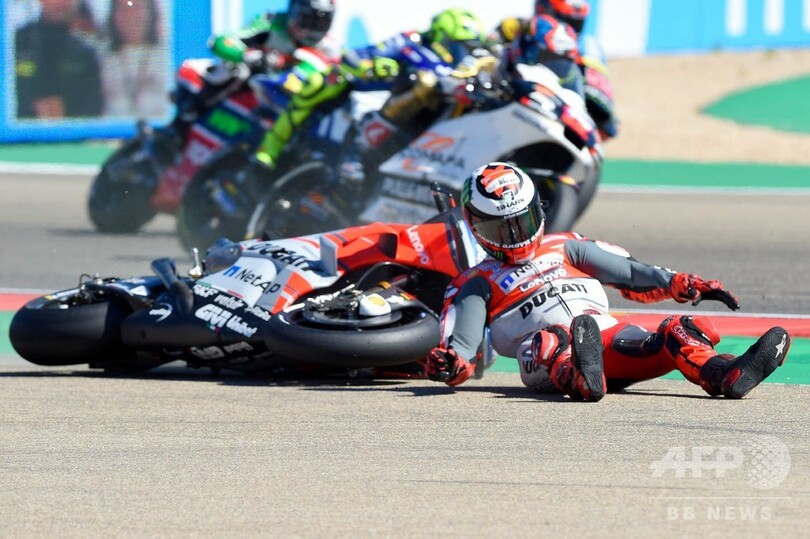 一方、ポールポジションからスタートしたドゥカティ(Ducati Team)のホルヘ・ロレンソ(Jorge Lorenzo、スペイン)は1周目のターン1でクラッシュし、爪先を脱臼する悲惨な一日を送った。