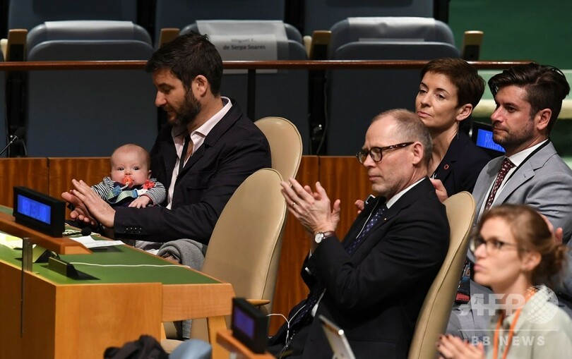 ゲイフォードさんは「きのう国連の会議室でおむつを替えていたら、日本の代表団が入ってきた。その時、彼らがどんなに驚いた表情だったか、撮れていたらなあ」とも書き込んでいる。(c)AFP