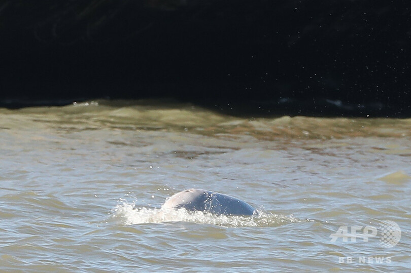 シロイルカが最初に目撃されたのは25日。翌日も同じエリアの川面に姿を見せ、AFPのカメラマンも写真に収めた。