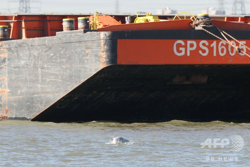 シロイルカが最初に目撃されたのは25日。翌日も同じエリアの川面に姿を見せ、AFPのカメラマンも写真に収めた。