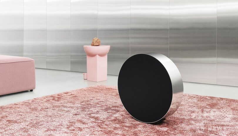 オブジェのような球形の照明で知られるプロダクトデザイナーのマイケル・アナスタシアデス(Michael Anastassiades)が手がけた直径約50cm、厚さ13cmの丸い筐体は、転がすように動かすことで音量調整が可能。音量に応じて背面のポートが開閉する世界初の技術「Active Bass Port」を搭載し、低音域の性能を強化した。