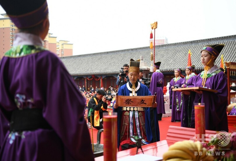 【10月7日 CNS】中国・吉林省(Jilin)長春市(Changchun)の文廟(Wen Miao)で9月28日、孔子生誕2569年記念を祝う式典が開かれ、「初献礼」「献祝」「行亜献礼」などの儀式が古式ゆかしくとり行われた。(c)CNS/JCM/AFPBB News
