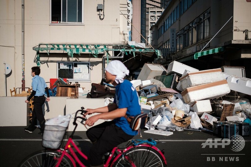 【10月7日 AFP】6日に営業を終えた東京都の築地市場は7日、豊洲市場への引っ越しが本格化し、築地名物の小型運搬車「ターレ」などが公道を走って豊洲市場に移動した。豊洲市場は今月11日に営業を開始する。(c)AFP