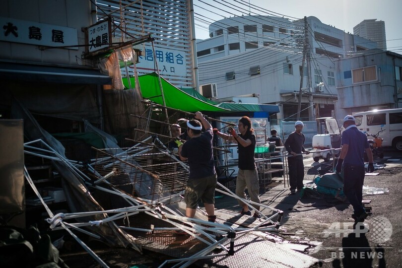 【10月7日 AFP】6日に営業を終えた東京都の築地市場は7日、豊洲市場への引っ越しが本格化し、築地名物の小型運搬車「ターレ」などが公道を走って豊洲市場に移動した。豊洲市場は今月11日に営業を開始する。(c)AFP