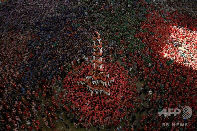 【10月8日 AFP】スペイン・カタルーニャ(Catalonia)州タラゴナ(Tarragona)でこの週末、第27回「人間の塔」の大会が開催され、「Colla Vella dels Xiquets de Valls」が優勝した。(c)AFP