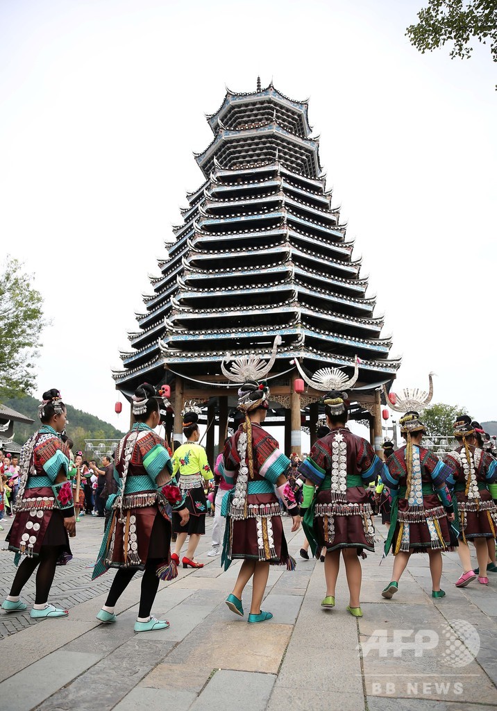 【10月15日 CNS】中国・貴州省(Guizhou)黔東南ミャオ族トン族自治州(Qiandongnan Miao and Dong Autonomous Prefecture)丹寨県(Danzhai)万達小鎮。華やかな盛装を身にまとった地元のミャオ族の演舞者が「蘆笙舞(Lusheng Wu)」を披露し、観光客も演舞の列に加わり、少数民族の独特な雰囲気を味わっていた。(c)CNS/JCM/AFPBB News