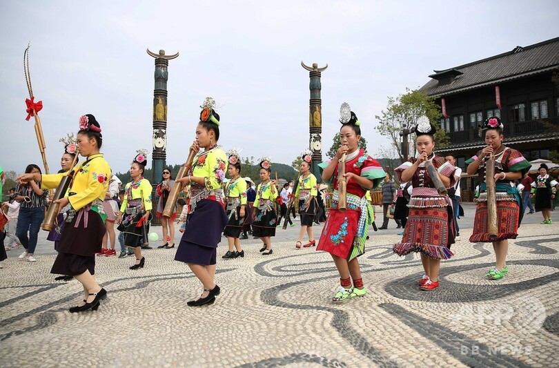 【10月15日 CNS】中国・貴州省(Guizhou)黔東南ミャオ族トン族自治州(Qiandongnan Miao and Dong Autonomous Prefecture)丹寨県(Danzhai)万達小鎮。華やかな盛装を身にまとった地元のミャオ族の演舞者が「蘆笙舞(Lusheng Wu)」を披露し、観光客も演舞の列に加わり、少数民族の独特な雰囲気を味わっていた。(c)CNS/JCM/AFPBB News