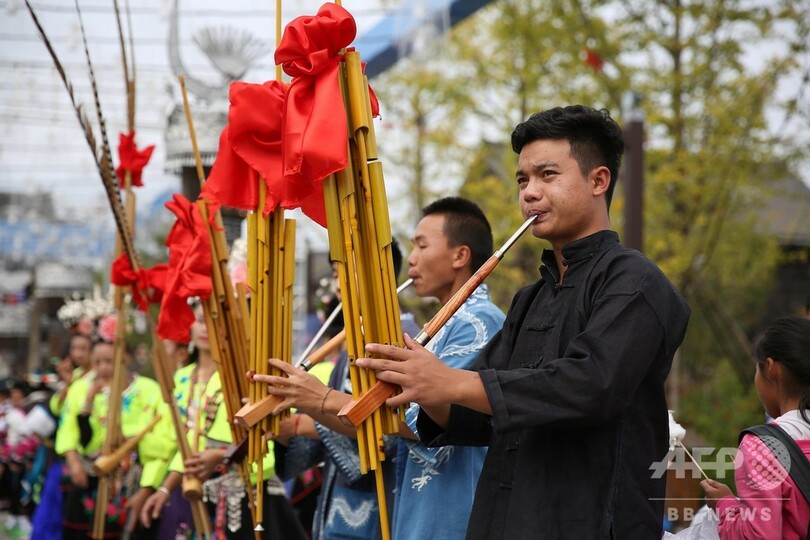 【10月15日 CNS】中国・貴州省(Guizhou)黔東南ミャオ族トン族自治州(Qiandongnan Miao and Dong Autonomous Prefecture)丹寨県(Danzhai)万達小鎮。華やかな盛装を身にまとった地元のミャオ族の演舞者が「蘆笙舞(Lusheng Wu)」を披露し、観光客も演舞の列に加わり、少数民族の独特な雰囲気を味わっていた。(c)CNS/JCM/AFPBB News