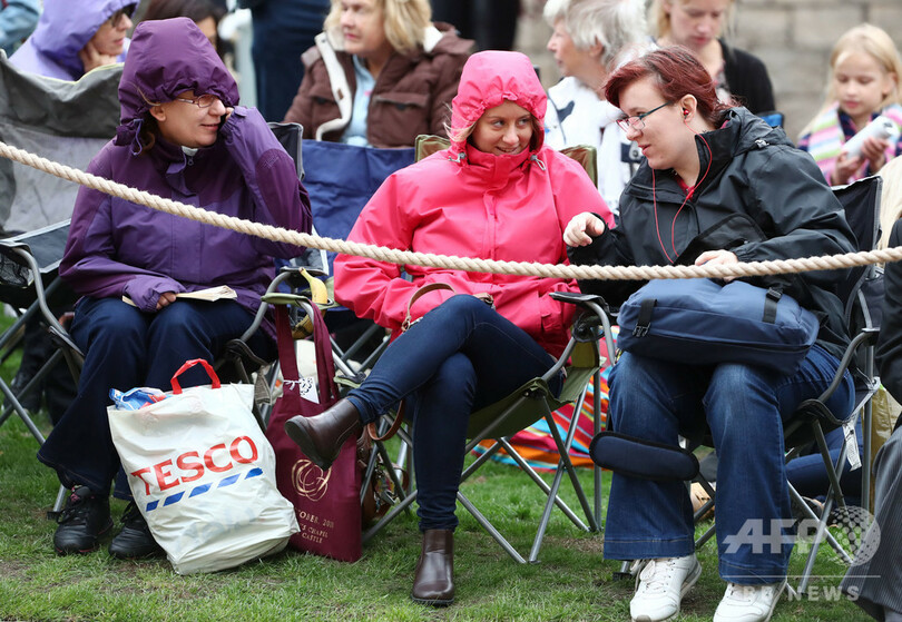 代わりに生中継したITVでは、この日の強風が話題になり、到着した参列者が風のため帽子を押さえたり、モーニングコートを調えたりする様子が長い時間、映しだされた。司会者の一人は「残念なことに、結婚式のための髪の毛がまとまる日ではないですね」と話した。(c)AFP/William EDWARDS